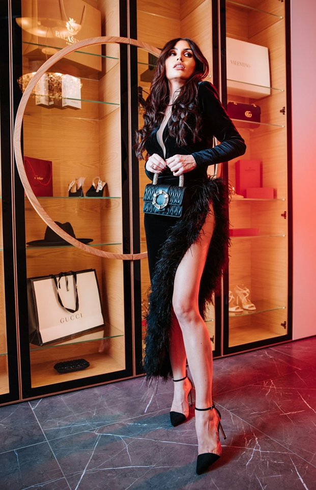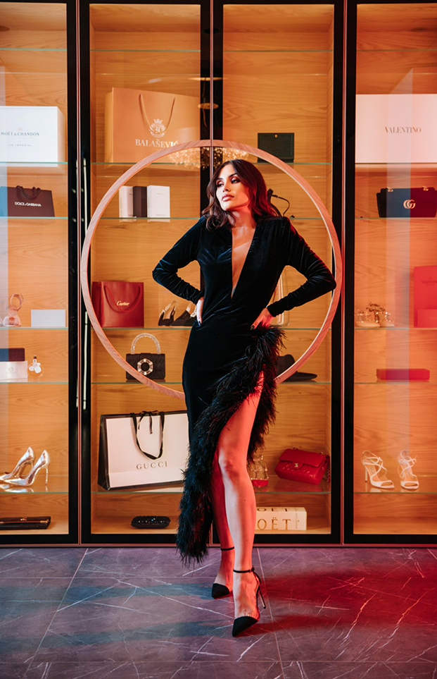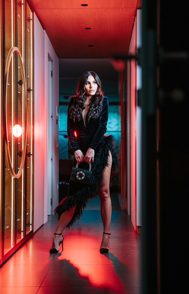 ČRNA OBLEKA IZ PLIŠA Z DODANIM PERJEM